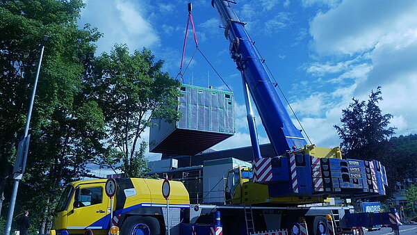 Ganz langsam, Millimeter für Millimeter, schwebte das über fünf Meter breite letzte OP-Saal-Modul am Kranhaken an seinen Platz. Der befindet sich zwischen zwei kleineren Raumzellen auf einem stählernen Tragwerk, das an den bestehenden OP-Trakt anschließt. Die Arbeiter wussten genau, wo sie hin fassen mussten; routiniert erledigte das Team dieses Bauprojekt. Nun beginnt der Innenausbau der Container zum OP-Saal. Im Herbst soll dieser in Betrieb gehen.